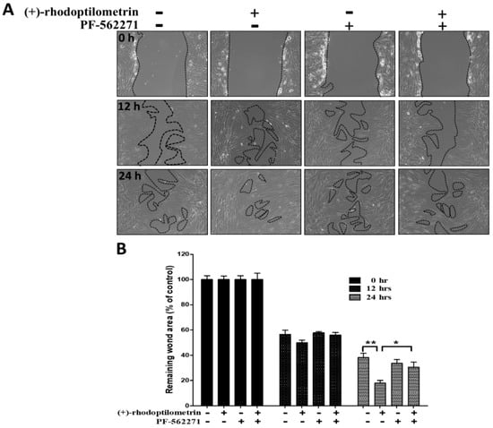 Effect of FAK inhibitor, PF-562271, on (+)-rhodoptilometrin-promoted wound healing in the hGF-1 cell. (A) After prior incubation with PF-562271 (10 μM) for 2 h, the cells were treated with scratch and (+)-rhodoptilometrin (10 μM) for 0, 12, and 24 h, and then photographed by phase-contrast microscopy at 100× magnification. (B) Scratch-test assay statistics of the remaining wound area were normalized with the time point 0 h. Data (means ± SEM) are representative of at least three independent experiments. Student’s t-test determined the significance; * p < 0.05, ** p < 0.01, compared with untreated cells in same time point.