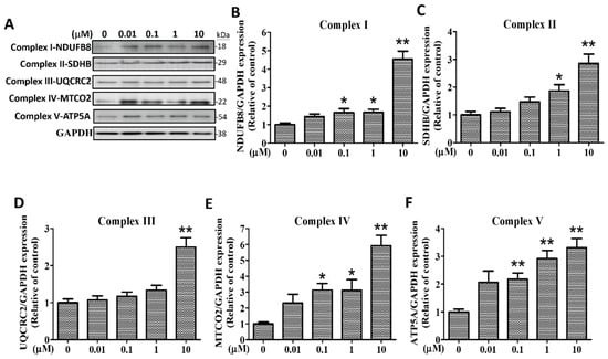 Effects of (+)-rhodoptilometrin on the expression of mitochondrial complexes I~V in hGF-1. (A) Complex I, II, III, IV, and V expression in hGF-1 cells was evaluated by western blot analysis after treatment with various dosages of (+)-rhodoptilometrin for 24 h. GAPDH was detected as the internal control. Complex I-NDUFB8 (B), complex II-SDHB (C), complex III-UQCRC2 (D), complex IV-MTCO2 (E), and complex V-ATP5A (F) levels were quantified by densitometry analysis using ImageJ software and were normalized with the level of GAPDH, expressed as a normalization of the control. Data (means ± SEM) are representative of at least three independent experiments. Student’s t-test determined the significance; * p < 0.05, ** p < 0.01, compared with untreated cells.