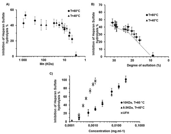 (A) Anti-HPSE (heparanase) activity of λ-CO produced at 40 °C and 60 °C as a function of their Mn for the inhibition of heparan sulfate hydrolysis by heparanase at 1.25 × 10−3 mg·mL−1. (B) Correlation between the DS of λ-CO produced at 40 °C and 60 °C and their inhibitory activity against heparan sulfate hydrolysis by heparanase. (C) IC50 of 10 kDa (produced at 60 °C, after 24 h) and 9.5 kDa λ-CO (produced at 40 °C, after 144 h) compared to native UFH (heparin); (HPSE = 100 ng·mL−1 and HS = 0.5 μg·mL−1).
