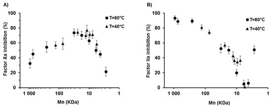 (A) Anti-Factor Xa activity of λ-CO produced at 40 °C and 60 °C as a function of their Mn, at 0.025 mg·mL−1 and (B) Anti-Factor IIa activity of λ-CO produced at 40 °C and 60 °C as a function of their Mn, at 0.125 mg·mL−1 (AT III = 0.625 μg·μL−1 and factor Xa or IIa = 11.25 nK at·mL−1).