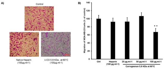 Since HPSE activity has been shown to be involved in the metastatic potential of cancer cells, the effect of a λ-CO derivative (5.9 KDa produced at 60 °C) on HPSE-associated migration were compared to native heparin using a transwell assay [55,56]. The highly motile MDA-231 breast cancer cells with high-level expression of HPSE were selected for this experiment [42,57]. As shown in Figure 5A, large number of control cells (treated with vehicle) passed through the pores towards the lower chambers in response to a 10% FBS (Fetal Bovine Serum) solution that was used as a chemoattractant. Treatment with native heparin led to a moderate 7.6% inhibition rate in accordance with previously published results [58,59,60]. Treatment with the λ-CO candidate at 100 μg·mL−1 significantly reduced the migration of MDA-MB-231 cells. The inhibition rate (32.8%) was higher than with heparin, while heparin had the best IC50 against HPSE activity (Figure 5B). The experiment was also repeated on the more quiescent MCF-7 breast cancer cell line (Appendix A, Figure A4) [61]. In this case, heparin slightly promoted the MCF-7 cells migration. Though, here, the λ-CO candidate again displayed an inhibitory activity of 12% on MCF-7 cell migration, however this was non-significant. As anticipated, this revealed that in addition to HPSE, the λ-CO candidate probably interacts with other molecules involved in the motility of cancer cells. It is known that migration is regulated by a complex interplay between varied glycosaminoglycans (e.g., syndecan-4 at the cell surface), protein expressions and degradative enzymes, in which heparin may have a different impact [62].