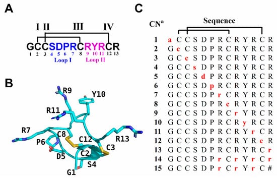 All peptides were synthesized using standard Fmoc (N-(9-fluorenyl)methoxycarbonyl) chemistry as described previously [42]. The RgIA and analogues 1–12 were prepared on Fmoc-l-Arg(Pbf)-Wang resin, while peptides 13 and 14 were carried out on Fmoc-d-Arg(Pbf)-Wang resin. The peptide 15 was synthesized on Rink amide resin. For peptides 1–13, each residue of RgIA was systematically replaced by its corresponding D-amino acid, and all arginine residues in peptides 14 and 15 were substituted with d-Args. In order to form two correct disulfides (CysI- CysIII, CysII-CysIV), we used a combination of trityl(Trt) and acetamidomethyl(Acm) for side chain protection of cysteines. Briefly, the linear peptides were deprotected from the resin by adding Reagent K (trifluoroacetic acid/water/ethanedithiol/phenol/thioanisole; 90:5:2.5:7.5:5, v/v/v/v/v) for 2 h at room temperature. Then, the resin was removed by filtration and the released peptides were precipitated and washed with cold ether. After lyophilization, the crude peptides were purified using a Vydac C18 column (300 Å, 5 µm, 10 mm × 250 mm) on a Wasters 2535 HPLC. Afterwards, the linear peptides were folded to form a disulfide using a two-step oxidation strategy. The first disulfide was formed under an oxidative condition using 20 mM potassium ferricyanide and 0.1 M Tris-HCl, pH 7.5, which reacted for 45 min, and the monocyclic peptide was purified by RP-HPLC. Then, the Acm groups were cleaved and form the second disulfide by iodine oxidation, as previously described [42]. All bicyclic products were purified by RP-HPLC. The purity of synthesized bicyclic peptides was determined by analytical RP-HPLC and monitored by absorbance at 214 nm (≥ 95% purity). Meanwhile, ESI-MS was utilized to confirm the identity of the products.