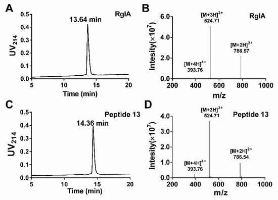 We used the d-amino acid scanning mutagenesis method to identify critical residues of RgIA. All peptides were synthesized by the standard Fmoc solid-phase synthesis strategy. To form the native CysI–CysIII and CysII–CysIV disulfide binding form (globular form), a two-step oxidation scheme was applied. The first pair of cysteine residues (CysI–CysIII) was linked by treatment with ferricyanide, and the second disulfide bond (CysII–CysIV) was then formed by iodine oxidation. Subsequently, all bicyclic peptides were purified by preparative reversed-phase high performance liquid chromatography (RP-HPLC). The synthesized products were identified using analytical RP-HPLC and electrospray ionization mass spectrometry (ESI-MS). The liquid chromatogram and mass spectrum of RgIA and peptide 13 are shown in Figure 2. The RgIA has a retention time of 13.64 min (min), whereas 13 is more hydrophobic, with a retention time of 14.36 min (Figure 2A,C). The observed average molecular mass (1571.13 Da) of RgIA and 13 was consistent with the theoretical mass (1590.79 Da) (Figure 2B,D). The additional analogues were synthesized by the same protocol.