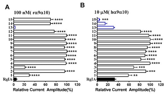 The effect of l-to-d amino acid conversion in RgIA analogues was determined on the rat and human α9α10 nAChRs by using a method of two-electrode voltage clamp recordings. Firstly, all variants were tested on rat nAChR at 100 nM. Meanwhile, they were also investigated on human α9α10 at a concentration of 10 μM because previous research proved that RgIA had a lower inhibition on human nAChR [22]. For the rat α9α10 nAChR, most analogues caused little inhibition or none, except for 1, 3, and 13. Strikingly, peptide 13 inhibited 97.2 ± 0.05% (n = 3) of current amplitude, even exceeding native RgIA, whereas analogues 1 and 3 had a lower activity, with 70.6 ± 2.0% (n = 5) and 78.7 ± 2.0% (n = 6) inhibition, respectively (Figure 3A). For human α9α10 nAChR, only three analogues, namely 13, 14, and 15, retained similar activity relative to the wild-type RgIA, which produced about 70–90% inhibition of ACh-evoked currents at 10 μM (Figure 3B). More impressively, peptides 14 and 15, of which l-Args were mutated to d-Args, preserved the inhibition affinity of human α9α10. On the contrary, they did not inhibit ACh-evoked currents of rat α9α10 nAChR (Figure 3).