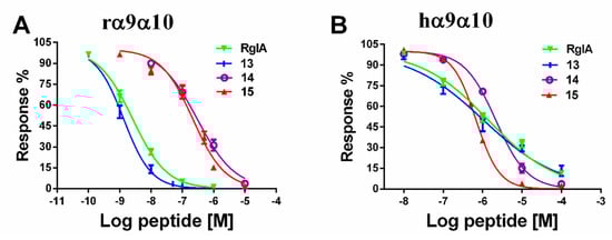 We also evaluated the binding affinity of all analogues on human α9α10 nAChR. Among them, a similar tendency was observed, and a total of 10 out of 15 mutants were not active. Peptides 3 and 8 had a deduction in IC50 values, which were 6440 nM and 6950 nM, respectively. Peptide 13 maintained a similar potency to RgIA, with an IC50 value of 1050 nM, whereas peptide 14 exhibited an IC50 of 2170 nM. Mutant 15 displayed an increased potency on human α9α10, with an IC50 value of 680 nM. Concentration-response relationship curves of critical analogues (13, 14, and 15) are shown for comparison in Figure 4.