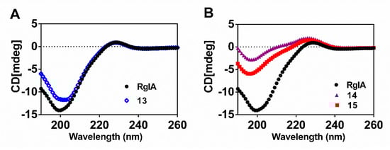 Representative CD spectra of wild-type RgIA and its variants. (A) The spectra of the native RgIA and peptide 13; (B) The spectra of the native RgIA, and peptides 14 and 15.