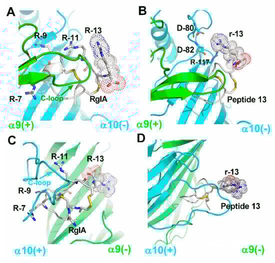 Molecular models of the interactions between wildtype RgIA, peptide 13, and rat α9α10 nAChR. The α9 subunit is drawn in green, the α10 subunit is in cyan, and the peptides are in white. (A) RgIA bound with the rat α9(+)α10(–) interface, where all arginine residues in RgIA are labeled. (B) The molecular model is shown between peptide 13 and α9(+)α10(–) interface, and amino acids around 4 Å radius of the r-13 are labeled. (C) RgIA bound with rat α10(+)α9(–) interface, where all arginine residues in RgIA are labeled. (D) The molecular model is shown between peptide 13 and α10(+)α9(–) interface. All images were produced by PyMOL.
