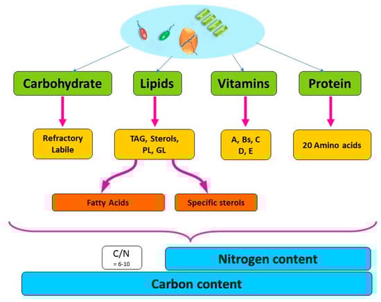 Carbon is the main element in most molecular structures in the phytoplankton cell and is often used as an indicator of the phytoplankton biomass. However, the quality of carbon can vary greatly based on the compound to which it is bound (Figure 1). In the phytoplankton cell, carbon is found in all macromolecules such as carbohydrates and lipids. Nitrogen is primarily bound in protein, and, as it is essential for phytoplankton growth, the nitrogen content has often been used to indicate the quality (i.e., the nutritional value) of the cell (most often as the C/N ratio). Nitrogen is also an essential part of vitamins, enzymes and some lipid complexes (Figure 1, Figure A1).