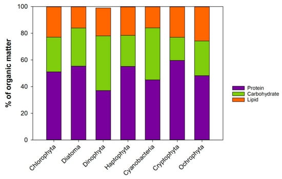 Protein is the main organic group measuring ca. 40–60% of the organic mass, with carbohydrates contributing approximately 17–40% and lipids about 16–26% (Figure 2, and references therein). This proportion is, however, dependent on the phytoplankton growth condition, as discussed in Section 3. In general, the average ratio of the protein, carbohydrates and lipids reported is remarkably similar between the different phytoplankton phyla, at approximately 5:3:2 (Figure 2). Proteins are engaged in almost all the tasks of the cellular activities. They are large complex molecules composed of one or more long chains of amino acids. They are important components of all membranes, involved in the transport of other molecules and ions across the membranes. Proteins are as diverse as the functions they serve. Most enzymes are proteins that organize, construct and receive signals, while the structural proteins maintain the shape of the cell. In animals, the structural proteins are the muscles and connective tissues. There are about 20 different types of amino acids that build up the protein structures, 10 of which are essential, (essential amino acids, EAA) i.e., cannot be synthesized de-novo by most organisms. The quality of marine proteins is measured by the presence of these EAAs, some of which have been found to be essential for the growth of some zooplankton species [16,17]. The synthesis of marine EAAs is found to be slower and more susceptible to nitrogen limitation compared to nonessential amino acids [18]. However, the protein quality (EAA) is found to be similar between many phytoplankton species [19], and the differences in protein quality appears to be secondary; that is, it is first evident when the other essential nutrients, such as essential fatty acids, are sufficient in the diet [19].