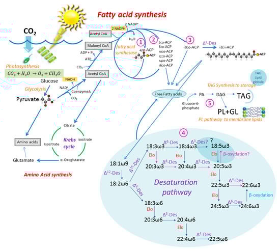 Simplified sketch of the fatty acid synthesis in the phytoplankton cell; from photosynthesis (glucose) to triacylglycerol (TAG), phospholipid (PL) and galactolipid (GL). The path towards amino acid synthesis is shown. Des: Desaturase, Elo: elongase, ACP: Acyl carrier protein. Inspired by: [25,33,34,35,36,37,38]. The desaturation pathway from [39,40], with an alternative pathway to 18:5ω3 as suggested by [41], is shown by red arrows. Paths ①–⑤ are discussed in the text. Updated from [23].