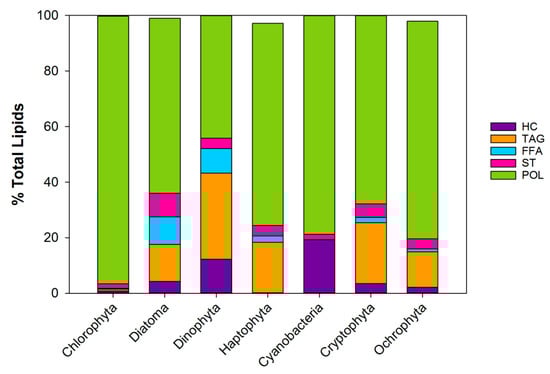 The different phytoplankton phyla contain different proportions of the lipid types hydrocarbon (HC), triacylglycerol (TAG), free fatty acids (FFA), sterols (ST), pigments, and polar lipids (POL), that include mainly phospholipids (PL) but also galactolipids (GL). Figure 4 depicts the average lipid class composition of 7 of the main phytoplankton phyla as % of the total lipids. The major lipid class in all the phyla are the polar lipids ranging from 40–95% of the total lipids (references in the figure’s caption).
