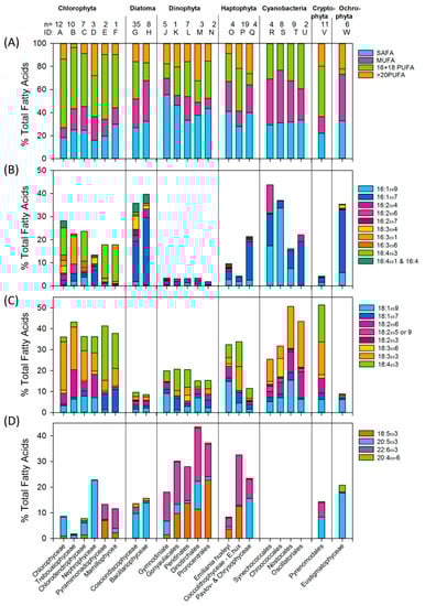 Fatty acid profiles of 7 phytoplankton phyla and 22 classes/orders as % of the total fatty acids. n: number of profiles behind the analysis. The proportion of (A) Saturated fatty acids (SAFA), mono-unsaturated fatty acids (MUFA), 16-18 Poly unsaturated fatty acids (PUFA) and >20PUFA, (B) C16 fatty acids (C) C18 fatty acids excluding 18:5ω3 (D) Octadecapentaenoic acid (OPA), eicosapentaenoic acid (EPA), docosahexaenoic acid (DHA) and arachidonic acid ARA. Upper case letters are the identification references to the classes listed on the x-axes where specific species are listed in the Supplementary Material. Compilation from: [20,43,44,45,46,55,57,58,59,60,61,62,63,64,65,66,67,68,69,70,71,72,73,74,75,76,77,78,79,80,81,82,83,84,85,86,87,88]. Updated from [23].