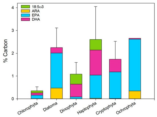 In contrast, Dinophyta (dinoflagellates) are high (20%) in C18 fatty acids and especially >20PUFA, where 22:6ω3 (DHA) and 18:5ω3 are the signature fatty acids for the phyla. One of the orders, J, has a low contribution of 18:5ω3 fatty acids but higher 20:5ω3.