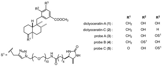 Chemical structures of dictyoceratin-A (1) and -C (2) and their probes (3–5).