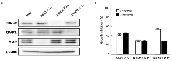 Growth of RBM28-, RPAP3-, and MIA30-knockdown DU145 cells under normoxic and hypoxic conditions. (a) The expression levels of the indicated proteins in each knockdown cell line were analyzed by western blotting. The expression level of each protein was calculated from its relative density, which was normalized to that of β-actin. (b) The proliferation rates of MIA3-, RBM28-, and RPAP3-knockdown DU145 cells were investigated under normoxic and hypoxic conditions. The growth inhibition rate was calculated as a percentage relative to the negative control cells. Differences were considered significant at * p < 0.01.