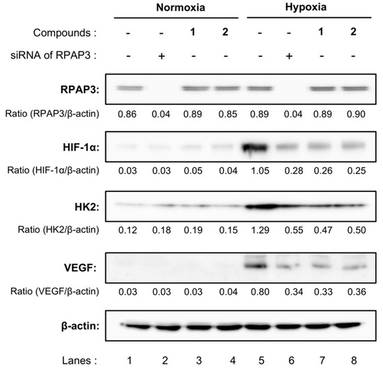 We further compared the expression of HIF-1α and related proteins in RPAP3-knockdown DU145 cells with those of DU145 cells treated with compound 1 or 2 (Figure 6). The expression levels of HIF-1α in DU145 cells were elevated under hypoxic conditions. Consistent with these findings, the expression levels of hexokinase 2 (HK2) and vascular endothelial growth factor (VEGF), which are regulated by HIF-1α, also increased by cultivating DU145 cells under hypoxic conditions (lanes 1 and 5). Treatment with dictyoceratin-A (1) or -C (2) reduced the expression levels of HIF-1α, HK2, and VEGF (lanes 3, 4, 7, and 8), as described previously [11]. Moreover, protein expression levels of RPAP3-knockdown cells were similar to those in 1- or 2-treated DU145 cells. Indeed, RPAP3-knockdown cells showed reduced HIF-1α, HK2, and VEGF expression (lanes 2 and 6).