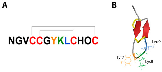 (A) Primary structure of MrIA showing Cys1-Cys3, Cys2-Cys4 disulfide connectivity, Cys residues are coloured red, (B) 3D structure of MrIA. Yellow portions represent disulfide bonds and red arrows represent β-sheets. Pharmacophore residues are coloured orange (Tyr), green (Lys), and blue (Leu).