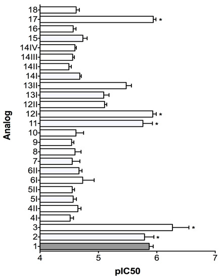 pIC50 values of MrIA analogs against human norepinephrine transporter (hNET) and their standard deviation bars. The MrIA standard (1) is coloured grey. Analogs whose hNET inhibitory activity do not significantly differ from the standard are marked by *.