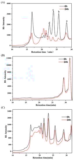 In order to assess the specific molecular weight changes of three oligosaccharides after 24 h fermentation, the AlgO, AO, and KCO degradation products were monitored by HPSEC. In the case of AlgO (Figure 1A), at 0 h, a large number of oligomers (22–30 min) and larger molecular weight (16–18 min) were observed. After 24 h fermentation, an obvious decline in the amount of oligomers, such as disaccharides, trisaccharides, tetrasccharides, and pentasaccharides, was observed and larger molecules were found to be degraded into smaller oligomers (20–22 min). In case of KCO (Figure 1C), at 0 h, a large number of oligomers (20–32 min) and larger molecules (15–20 min) were observed. A mild decrease in the number of larger molecules (15–20 min) and mild increase of smaller molecules (32 min) were observed after 24 h fermentation by pig fecal bacteria. However, AO (Figure 1B) was utilized to a smaller extent by the pig fecal microbiota after 24 h fermentation. This result indicated that AlgO was utilized and degraded by the pig fecal microbiota after 24 h fermentation, whereas KCO was degraded into smaller molecules to a lesser extent and AO was hardly utilized by the pig fecal microbiota after 24 h fermentation.