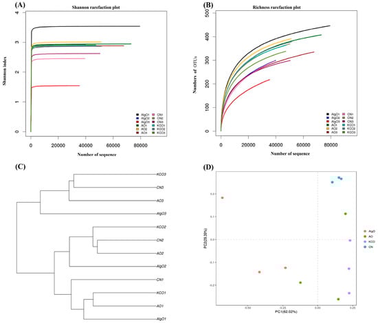 Response of the gut microbiota structure in each culture after 24 h fermentation (A) Shannon rarefaction analysis, (B) richness rarefaction analysis, (C) unweighted clustering analysis of gut microbiota, and (D) PCA score plot of gut microbiota at different OTU levels. AlgO: alginate oligosaccharides; AO: agarose oligosaccharides; KCO: κ-carrageenan oligosaccharides; CN: control.