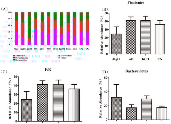 Relative abundance of different phyla in the pig fecal microbiota in each group after 24 h fermentation. (A) Relative abundance of gut microbiota at the phylum level, (B) relative abundance of Firmicutes, (C) relative abundance of Bacteroidetes, and (D) the ratio of Firmicutes and Bacteroidetes. AlgO: alginate oligosaccharides; AO: agarose oligosaccharides; KCO: κ-carrageenan oligosaccharides; CN: control; F: Firmicutes; B: Bacteroidetes.