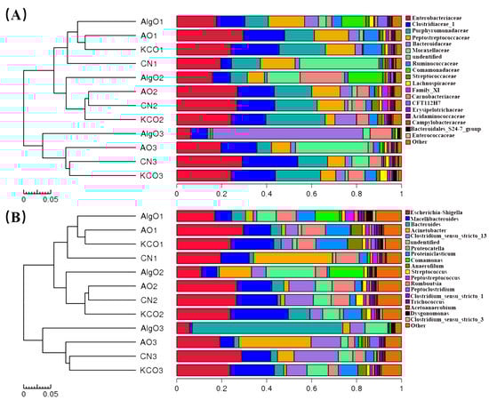 Relative abundance of gut microbiota at the family level (A) and genus level (B). AlgO: alginate oligosaccharides; AO: agarose oligosaccharides; KCO: κ-carrageenan oligosaccharides; CN: control.