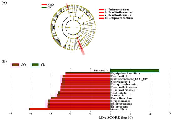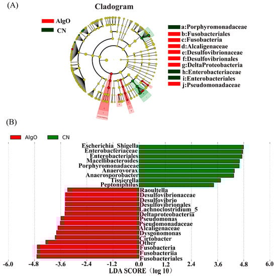 Linear discriminant analysis effect size (LEfSe) analysis identifying the significantly abundant taxon between control (CN) and the alginate oligosaccharides (AlgO) groups. (A) The taxa meeting a significant LDA threshold value of >2 were shown in AlgO and CN groups. (B) Taxonomic cladogram obtained using LEfSe analysis of the 16S sequence. Red: AlgO-enriched taxa; green: CN-enriched taxa.