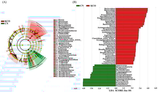 Linear discriminant analysis effect size (LEfSe) analysis identifying the significantly abundant taxon between control (CN) and κ-carrageenan oligosaccharides (KCO) groups. (A) The taxa meeting a significant LDA threshold value of >2 were shown in KCO and CN groups. (B) Taxonomic cladogram obtained using LEfSe analysis of the 16S sequence. Red: KCO-enriched taxa; green: CN-enriched taxa.