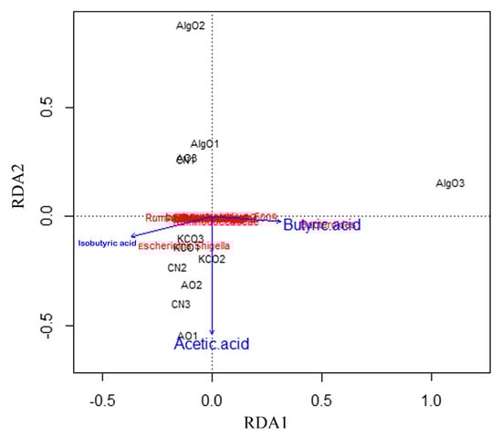 To relate the changes in microbiota composition to the different oligosaccharides and different SCFAs as main metabolites of microbial fermentation, the relative abundance of 17 taxa was subjected to redundancy analysis (Figure 8). AlgO alone appeared to be obviously distinct from the CN group. Positive correlations were observed between the gut microbiota structural changes and presence of acetic acid, isobutyric acid, and butyric acid. In addition, Escherichia and Shigella were negatively correlated with butyric acid, whereas positive correlations were observed with isobutyric acid and acetic acid. The microbia, such as Bacteroides, Enterococcus, Enterococcaceae, Coprococcus_1, Ruminococcaceae, and Roseburia were positive correlated with butyric acid.