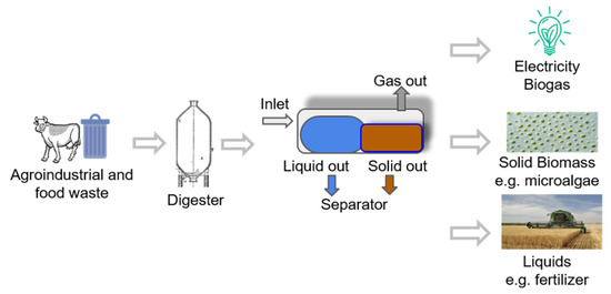 Microalgae biotechnology valorization scheme to produce energy and bio-compounds from agro-industrial and food waste.