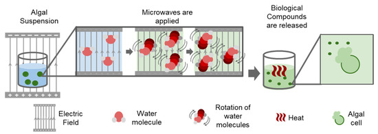 Microwave extraction involves heating of samples in a polar solution such as ionic liquids, ethanol, methanol, chloroform, acetone, and ultra-pure water by placing them in an alternating electric field. The solvent molecules align according to the applied electric field and quickly increase the temperature of the samples as a result of the inter- and intramolecular friction caused by this movement. The algal cell walls break with this sudden increase in temperature and release the compounds of interest (Figure 2). The resulting extract must undergo further purification as this process does not result in the isolated compound of interest [56]. This method differs from conventional heating extraction methods as it does not depend on the diffusion rate of the mixture mass. Therefore, microwaves heat the solvent which interacts with all the sample and prevents the formation of hot-spots and allowing for more homogeneous thermoregulation of the cell mixture. Further, it is quick and has been demonstrated to be at least ten times faster than conventional bath heating extraction methods, as mentioned by Balasubramanian et al. [56]. Additionally, the same study showed that the use of this method is especially beneficial when extracting lipids from microalgae, as it allows for a final product of better quality, with higher unsaturated lipids and antioxidant concentrations in comparison to the conventional Soxhlet extraction. In a second study involving pigment extraction from Dunaliella tertiolecta and Cylindrotheca closterium, it was demonstrated that microwave extraction techniques are more efficient than solvent-based techniques in overcoming mechanical resistance factors that limit solvent penetration into the cells [57].