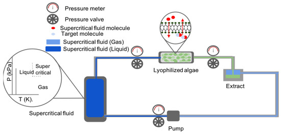 This extraction method depends on the usage of supercritical fluids (e.g., carbon dioxide, water, methane, ethane, methanol, ethanol, acetone, and nitrous oxide), induced either by temperature or pressure excitation, for the recovery of valuable products. Such fluids are capable of crossing the cellular membrane and wall of microalgae and solubilize internal metabolites to extract them from the cell (Figure 3). In most cases, supercritical fluids’ induction conditions range between for pressure and for temperature in order to allow for an energy efficient extraction (where, is the critical pressure constant and is the critical temperature constant for the supercritical fluid) [61]. The most common and preferred solvent used for this method is CO2 as it has an ambient critical temperature, is non-flammable, is chemically inert, non-toxic, and inexpensive [61]. As such, it is able to meet the ecological and chemical safety standards required for the extraction of high purity biological products (such as pigments for cosmetics and antiviral agent in medicine) as it leaves no harmful solvent residues and prevents thermal degradation of sensitive products. Moreover, with the addition of a polar entrainer (such as water) the solvent is able to dissolve polar compounds as well [61], thus allowing for a robust extraction procedure.