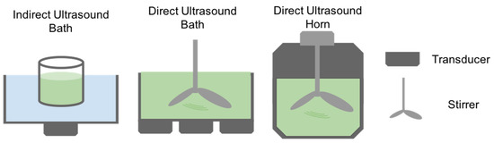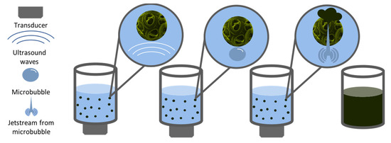 The technique of Ultrasound Extraction uses high-frequency sound waves to disrupt algal cell walls leading to the subsequent release of the compound of interest. As shown in Figure 4, the process depends on a physical phenomenon called cavitation where the disruption of the solvent caused by the sound waves, creates small bubbles. The bubbles generate strong jet streams as they implode by the effect of the acoustic cavitation force. When the bubble is close to a cell, allow for the puncturing of the cell wall and membrane [67]. The particular solvent used for this extraction method depends on the physical characteristics of the target compound, and subsequent fractionations are needed to isolate the compound of interest. Ultrasound extraction may occur directly as well as indirectly. Indirect ultrasound consists of placing a transducer touching the outer surface of a water bath. In the case of direct ultrasound extraction, the transducer can be close to the container where the bath occurs or in the form of an ultrasound horn in the sample (Figure 5). The advantages of this method include faster and substantial yields than other conventional techniques and moderate to low costs, in addition to minimal toxicity [68]. According to Kledjus et al. [69], it also allows for a more efficient extraction in freshwater algae species. On the other hand, the technique might negatively affect the quality of the oils as well as the integrity of polyunsaturated fatty acid rich oils. Furthermore, it cannot be scaled up [67].