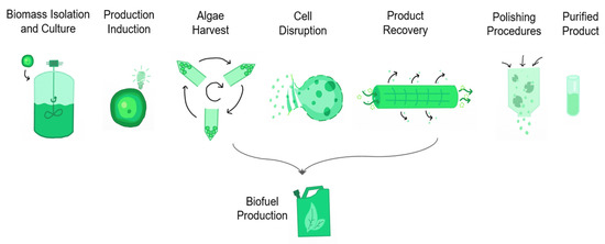 The substitute for conventional diesel is biodiesel, the result of transesterification of lipids. The production of biodiesel is currently done by processing oily seeds from palm, castor bean, sunflower, corn, and cotton, among others [163,164,165]. As discussed before, microalgae are a huge producer of fatty acids that can be converted into biodiesel [59]. For instance, around 50% of Chlorella, Nannochloropsis, Dunaliella, Scenedesmus, and Scenedesmus composition are lipids. Microalgae biofuel has a high calorific value, low viscosity, and low-density properties turning it in a more suitable biofuel than lignocellulosic materials [166].