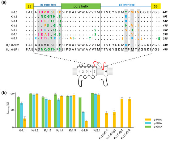 (a) Aligned amino acid sequence of the central, toxin-interacting channel region shown for one subunit of the Kv1 family (Kv1.1–Kv1.6), Kv2.1, and of the chimeras Kv1.6-5P2 and Kv1.6-5P1, which were all tested against μ-PIIIA, μ-SIIIA, and/or μ-GIIIA, respectively. by Leipold et al. [1]. Amino acids are coloured according to their physicochemical properties (basic—light blue; acidic—magenta; polar/neutral—green; non-polar polar/hydrophobic—orange). The secondary structure elements are indicated above the alignment. (b) Activity rates [%] of μ-PIIIA, μ-SIIIA, and μ-GIIIA on potassium channels Kv1.1–Kv1.6, Kv2.1, and Kv1.5–Kv1.6 chimera channels, as published by Leipold et al. [1]. Lower percentage values of Iremaining correspond to higher blocking activities.