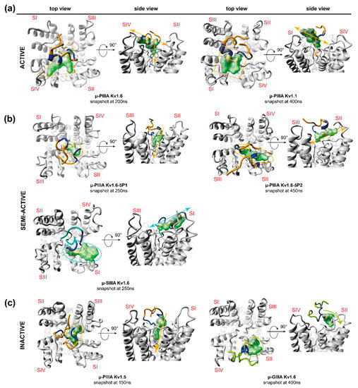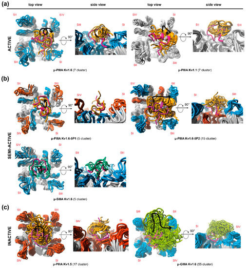 Secondary structure representation of the identified clusters, which were derived from the molecular dynamics simulations showing one representative per main cluster (4 Å toxin RMSD threshold) for (a) active, (b) semi-active, and (c) inactive systems. The black traces with arrowhead in the top view figures indicate the toxin movement on the channel surface throughout the simulation. The total numbers of identified clusters are given for each toxin-channel system in brackets. Colouring: μ-PIIIA—orange; μ-SIIIA—turquois; μ-GIIIA—green. Channel loops: Kv1.5—red; Kv1.6—blue; Kv1.1—grey. Channel subunits are indicated by Roman numerals (SI–SIV).