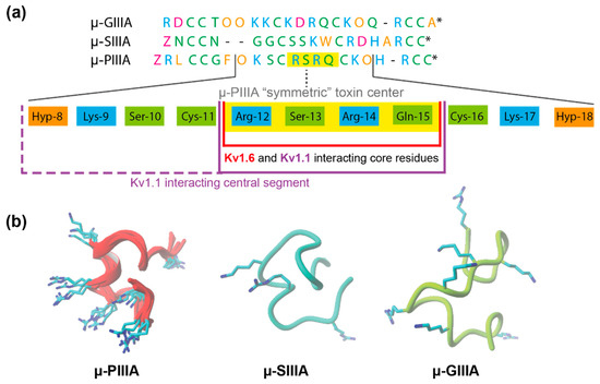 (a) Alignment of the µ-conotoxins µ-GIIIA, µ-SIIIA, and µ-PIIIA. Residues are coloured by their physicochemical properties (purple—acidic; cyan—basic; orange—nonpolar/hydrophobic; green—polar/neutral). The “symmetric” µ-PIIIA centre is given below the alignment, highlighting the central interacting motif of µ-PIIIA in yellow. (b) Structures of µ-PIIIA (superposition of all of the docked structures), µ-SIIIA, and µ-GIIIA when bound at the KV channel after HADDOCK docking.