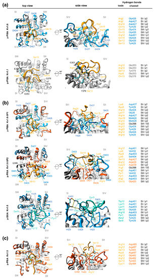 μ-PIIIA-Kv1.1/1.6: As already mentioned earlier in the text, a very similar µ-PIIA orientation on KV1.6 and on KV1.1 was revealed. Primarily, this effective and stable pore block appeared to arise from interactions of the centrally located toxin residues (Figure 3a), which were evenly distributed towards at least three of the four subunits (SII–SIV). For μ-PIIIA bound to KV1.6, the pore block was even further stabilized by the interactions of Arg-2 with the inner P2 loop residues of subunit I (SI) (Figure 4). Interestingly, for KV1.6-bound µ-PIIIA, the hydrogen bonds were primarily formed towards the residues of the inner pore loops (P2), whereas for μ-PIIIA bound to KV1.1, more residues of the outer loops (P1) were addressed (Figure 4).