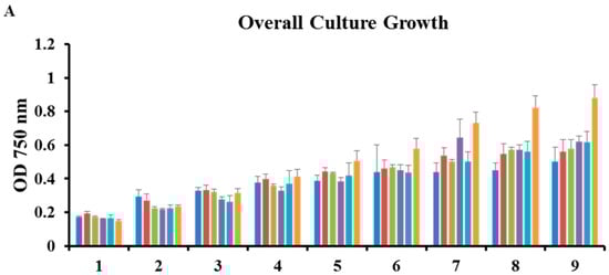 A fluridone standard obtained from Sigma-Aldrich, Inc. (St. Louis, MO, USA) was dissolved in 100% ethanol and diluted accordingly: 304, 152, 76, 38, 19, 0 µM. Chlorococcum sp. culture was added to two individual 96 well microplates from BRAND® GmbH & Co. KG (Wertheim, DE) at an optical density (OD) of 0.1, 250 µL per well; adapted from Franz, et al., 2013 []. Fluridone was subsequently added to the microplates according to the above concentrations and incubated for ten days under the following conditions: light (22 µE per s−1m−2), CO2 (1%), temperature (24 °C). Plates were read at wavelengths 750 nm (biomass), 680 nm (chlorophyll), and 450 nm (carotenoids) over a ten day period using a SPECTRAmax microplate spectrophotometer, Molecular Devices (Sunnyvale, CA, USA).