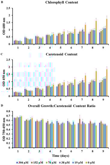 Micro-plate bioassay growth charts of Chlorococcum sp. over a series of fluridone treatments (A) Overall Culture Growth (750 nm); (B) Chlorophyll Content (680 nm); (C) Carotenoid Content (450 nm); (D) Overall Growth:Carotenoid Content Ratio used to determine optimal fluridone concentration (750:450 nm). * n = 4 for all samples; excluding day 6–304 µM, where n = 3. Asterisks indicate statistical significance in panels A–C. Significance in panel D not applicable.