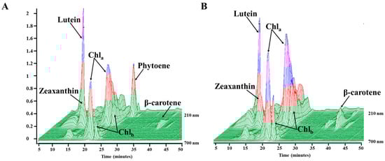 HPLC 3D chromatograms of cellular extracts from Chlorococcum sp., day 4 harvest (A) exposed to fluridone (152 µM). Note that phytoene was detected eluting at ~27 min. (B) the absence of phytoene without the addition of fluridone. Lutein, zeaxanthin, β-carotene and chlorophyll a/b are also denoted.