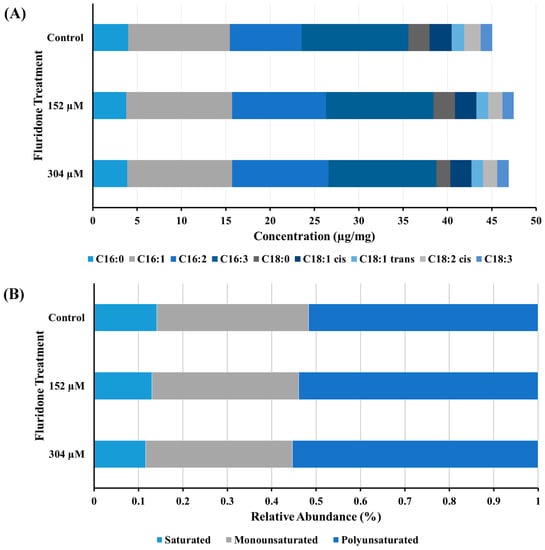 The fatty acid profile of cellular extracts obtained on day 4 from Chlorococcum sp. were analyzed for the observation of any potential downstream effects on fatty acid desaturase enzymes, in which previous studies have shown herbicides with this mode of action have exhibited inhibitory effects []. The FAs C16:0 and C16:3 remained relatively conserved within concentrations and controls, comparatively speaking. (panel A, Figure 3). However, the mono and poly-unsaturated FAs showed a slight increase in the presence of fluridone, from ~11 µg/mg (controls) to ~12 µg/mg (+ fluridone), and from ~8 µg/mg (controls) to ~11 µg/mg (+ fluridone), in C16:1 and C16:2, respectively (panels A & B, Figure 3). The increase in abundance of the aforementioned FAs was similar in both fluridone treatments (panels A & B, Figure 3). The abundance of the mono-unsaturated and poly-unsaturated FAs C18:1 cis/trans, C18:2 cis, and C18:3 in cultures incubated with 152 µM and 304 µM fluridone were not significantly different from that of the control cultures or between concentrations; < 0.5 µg/mg difference (panel A, Figure 3). C18:0 concentration increased slightly in cultures incubated at 152 µM: from ~1.5 µg/mg (304 µM), to ~2.5 µg/mg (152 µM) (panel A, Figure 3). A two-way analysis of variance (ANOVA), using the Holm-Sidak method, was performed to determine any significance between FA levels, fluridone treatment, and treatment concentration (152 µM vs. 304 µM). Statistical significance has been noted for FA abundance between herbicide treatments and controls. However, statistical significance was not observed when comparing the two treatment concentrations. In other words, we did not see a significant change in the effect of 152 µM over 304 µM and the resulting FA abundance, overall. It should be noted, though, that C18:0 abundance was significantly different between the two concentrations, as an exception to the former statement. P ≤ 0.001. Note: * n = 3 for all samples; excluding C16:2, where n = 2. Total FAME concentrations are also outlined in the supplementary material, Supplementary Table S2 (S3).