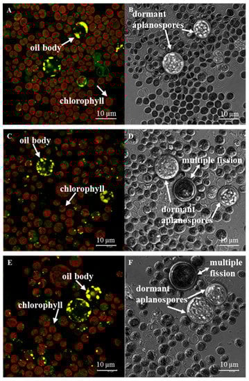 Confocal fluorescence images (left); corresponding DIC images (right) of Chlorococcum sp.—panels (A,B) without fluridone, (C,D) with 152 µM fluridone, (E,F) with 304 µM fluridone. Arrows in panels (A,C,E) point either to cells with oil bodies (yellow fluorescence) or chlorophyll (red fluorescence); arrows in panels (B,D,F) point to dormant aplanospores (containing oil bodies), and multiple fission cells (double-headed arrows).