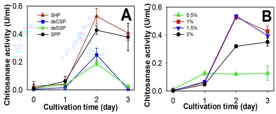 To explore chitosanase production by P. mucilaginosus TKU032, four chitinous materials from fish processing (SPP, SHP, deCSP, and deSSP) were used as the sole C/N sources during incubation. As shown in Figure 1, TKU032 chitosanase was found to exhibit the highest activity at day 2 of the cultivation on all types of chitinous material sources, in which the maximum enzyme activity was expressed with SHP (0.53 U/mL) higher than SPP (0.42 U/mL, p-value 0.0384), deCSP (0.25 U/mL, p-value 0.0028), and deSSP (0.18 U/mL, p-value 0.0005), respectively. The reason might be related to the difference in protein/chitin/mineral salts ratio of each chitinous material, in which SHP contents had higher amounts of protein and mineral salts but lower amount of chitin than those of the other materials [,]. This result was also unlike previous reports, which suggested that chitosanase from Paenibacillus strains often show the highest activity on medium containing SPP [,].