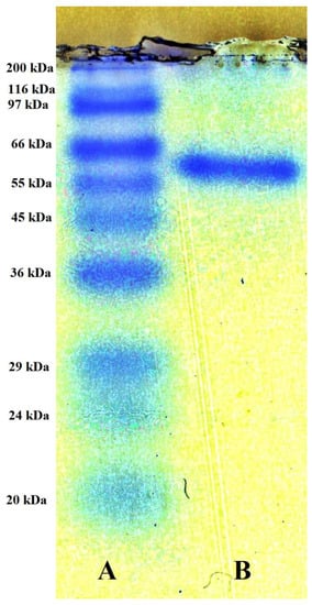 In order to characterize TKU032 chitosanase, a series of steps was used to purify the enzyme, including (NH4)2SO4 precipitation, Macro-prep High S ion exchange chromatography and KW802.5 gel filtration. The chitosanase was eluted by 20 mM Tris-HCl buffer (pH 7) with a linear gradient of 0–1 M NaCl on a Macro-prep High S column. As shown in Figure 2, there was only one peak of chitosanase activity, located at the washing stage of the ion-exchange chromatography separation. This result indicated that pI of TKU032 chitosanase might be ≥7. The peak fractions (fraction numbers 5-15) showing chitosanase activity were collected. After Macro-Prep High S chromatography, 15.98 mg of protein was obtained with an increase in the specific activity from 0.7 U/mg to 4.25 U/mg and a slight reduction in the activity yield from 31.69% to 24.06%. The purification was then confirmed by HPLC gel filtration using the KW802.5 column. Similar to the ion-exchange chromatography, only one peak of chitosanase activity was found by the HPLC analysis (data not showed). After purification, one chitosanase was obtained; its profile is summarized in Table 2. In other reports, only one chitinase/chitosanase was isolated from the culture medium of Paenibacillus species [,,,,,,,,,,,]. The specific activity and recovery yield of the purified chitosanase were 5.13 U/mg and 10.94%, respectively. By using SDS-PAGE analysis, the molecular weight (MW) of the TKU032 chitosanase was determined as approximately 59 kDa (Figure 3), which fell within the MW’s range (35–85 kDa) of chitinase/chitosanase from most Paenibacillus strains [,,,,,,,,,,,], with an exception from Paenibacillus sp. FPU-7 chitinase (150 kDa) [].