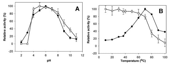 Effect of pH (A) and temperature (B) on activity (●) and stability (□) of TKU032 chitosanase.