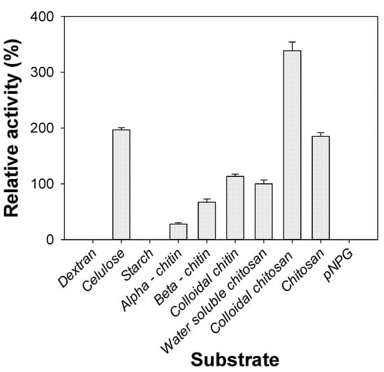 The activity of the purified P. mucilaginosus TKU032 chitosanase on various substrates is shown in Figure 5. Chitosanase activity was expressed in the descending order of colloidal chitosan > cellulose > chitosan > colloidal chitin > water-soluble chitosan > β-chitin > α-chitin. No activity was shown on dextran, starch, or p-nitrophenyl-N-acetyl-β-d-glucosaminide (pNPG). These results suggest that the physical form of the substrate had a strong effect on the rate of hydrolysis. Unlike P. macerans TKU029 chitosanase, where the most suitable substrate was water-soluble chitosan [], P. mucilaginosus TKU032 chitosanase demonstrated excellent activity on colloidal chitosan (338.74%), followed by chitosan powder (185.38%). It also showed good activity on chitin substrates, expressing 113.24%, 67.19%, and 27.67% on colloidal chitin, β-chitin, and α-chitin, respectively, as well as on cellulose (196.84%). These results indicate that P. mucilaginosus TKU032 chitosanase could express good activity on various types of substrates, including cellulose, chitin, and chitosan. Since pNPG is a specific substrate of exochitinase, it was logical that P. mucilaginosus TKU032 chitosanase would not show any exochitinase activity.