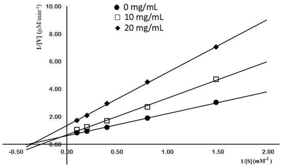 As α-glucosidase inhibitors are an important therapy for type 2 diabetes, the COS fractions were also investigated for α-glucosidase inhibitor activity. As shown in Figure 8B, only fraction I expressed dose-dependent aGI activity within a range of 1–20 mg/mL. At 20 mg/mL, fraction I exhibited 65.86% inhibitory activity on yeast α-glucosidase, which was weaker than acarbose (88.21% at 10 mg/mL) with 0.0005 of p-value. Only COS with higher MW showed aGI activity, unlike the results of Jo et al. (2013) who found similar aGI activity in rat α-glucosidase from 3 different molecular weight COS fractions []. For further investigation, the inhibition model of fraction I on yeast α-glucosidase was analyzed using a Lineweaver-Burk plot. Figure 9 shows that when the concentration of COS fraction I increased from 0 to 20 mg/mL, 1/VM increased but -1/KM varied. This suggests that the aGI activity of COS fraction I follows the mixed noncompetitive inhibition model. Although chitosan and COS have been widely studied for treating diabetes [], there have been few reports on their inhibition of α-glucosidase, a key enzyme in the digestive system that hydrolyzes dietary carbohydrates to increase blood glucose concentration. As such, this result could prove a novel contribution to aGI research.