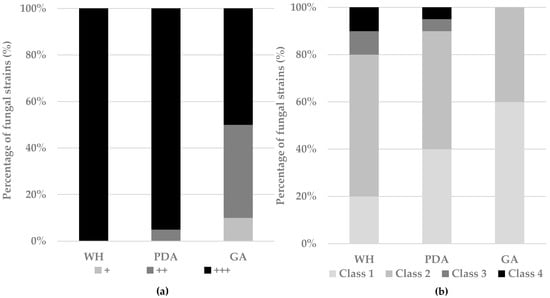 Inoculated multiwell plates were incubated in the dark at 24 °C for two weeks. The production of exudates (e), soluble pigments (s), and production of conidia (h) were recorded. Fungal growth was classified as follows: no growth (−), development of the fungal mycelium only on the inoculum disc (+), mycelium covering of the area of the well (++), and fungal mycelium covering the entire surface of the well (++).