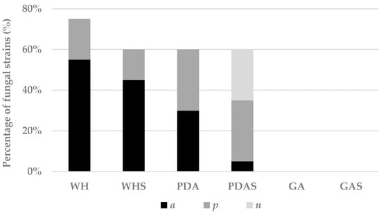 Interactions with Streptomyces sp. MUT 2498 were determined as antagonism (a) where the growth of the fungus stopped at a distance from the bacterial colony, predominance (p) where the fungus grew on the bacterium, and no growth of the bacterium (n) [27].